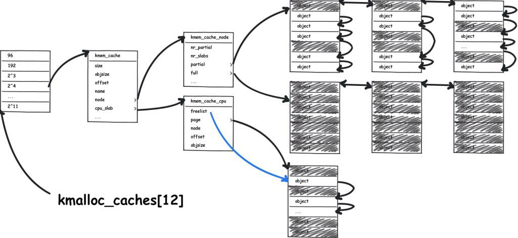 slub把内存分组管理,每个组分别包含8,16,32,...,2048个字节,在4K页大小的默认情况下,另外还有两个特殊的组,分别是96B和192B,之所以这样分配是因为如果申请2^12B大小的内存,就可以使用伙伴系统提供的接口直接申请一个完整的页面,加上整页分配共12组,