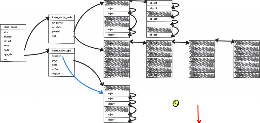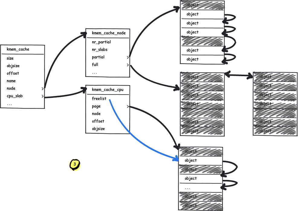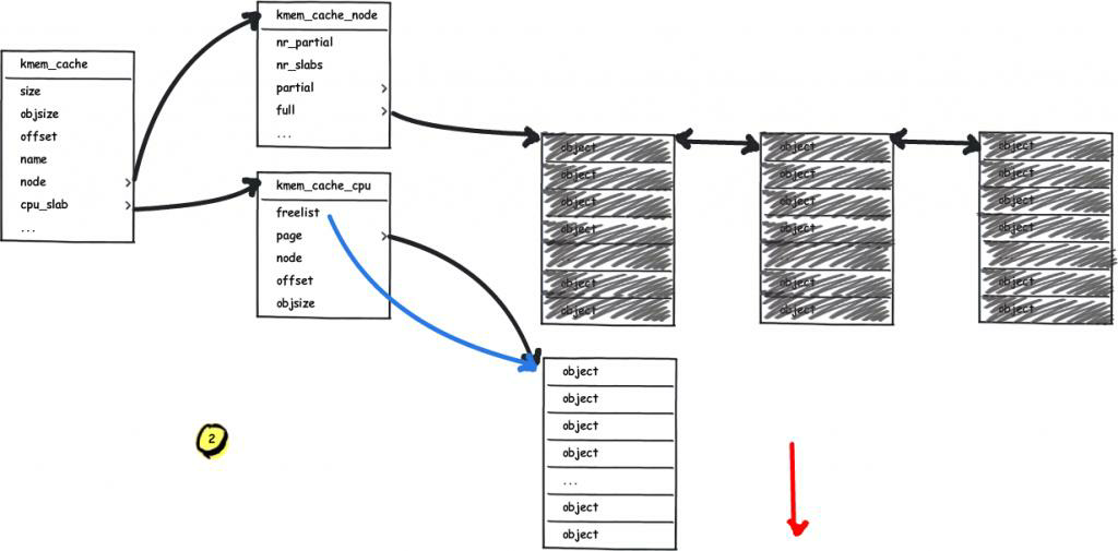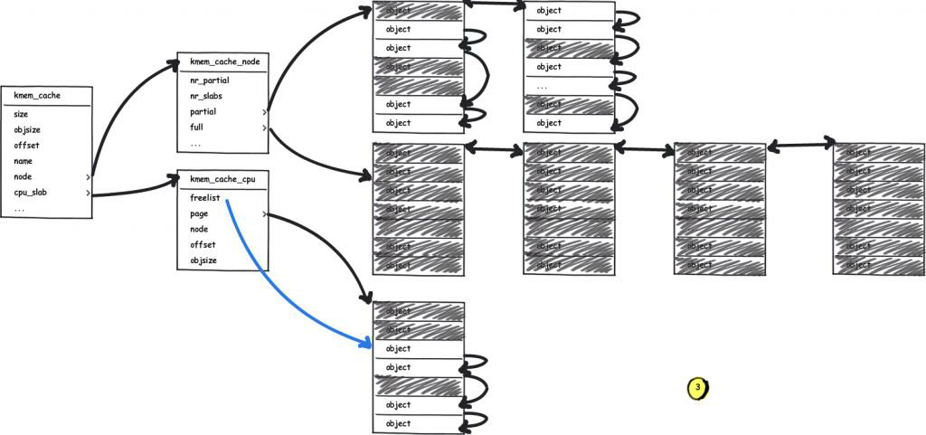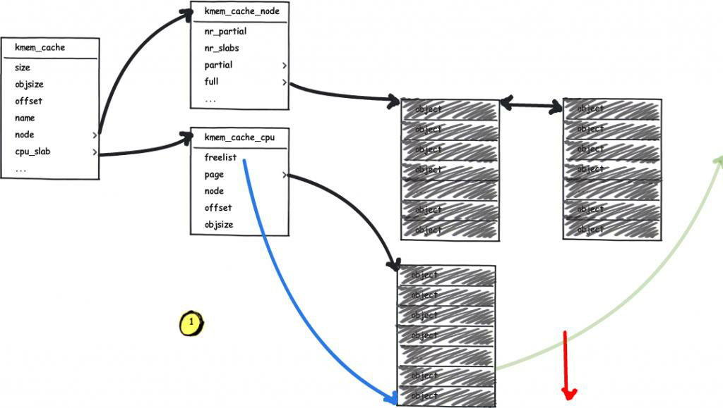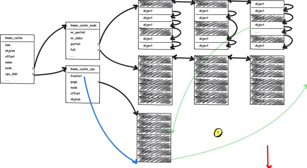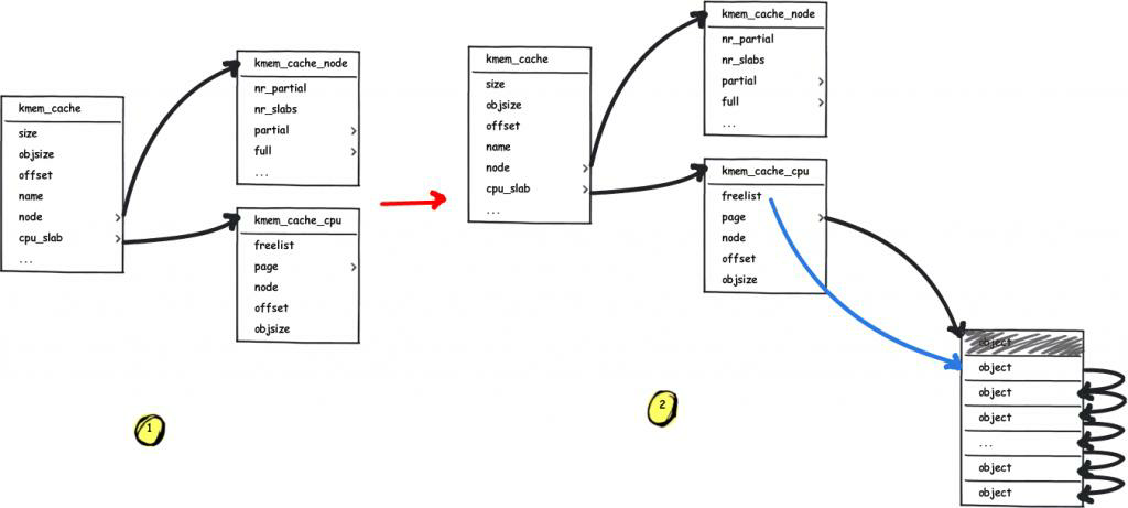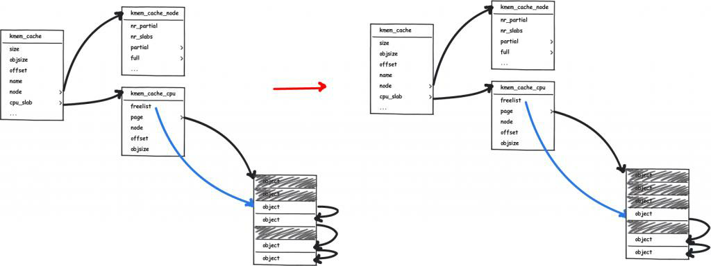这种情况是最简单的一种,直接把kmem_cache_cpu中保存的一个空闲object返回给用户,并把freelist指向下一个空闲的object