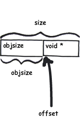 物理页按照对象object大小组织成单向链表,对象大小由objsize指定的。例如16字节的对象大小,每个object就是16字节,每个object包含指向下一个object的指针,该指针的位置是每个object的起始地址+offset